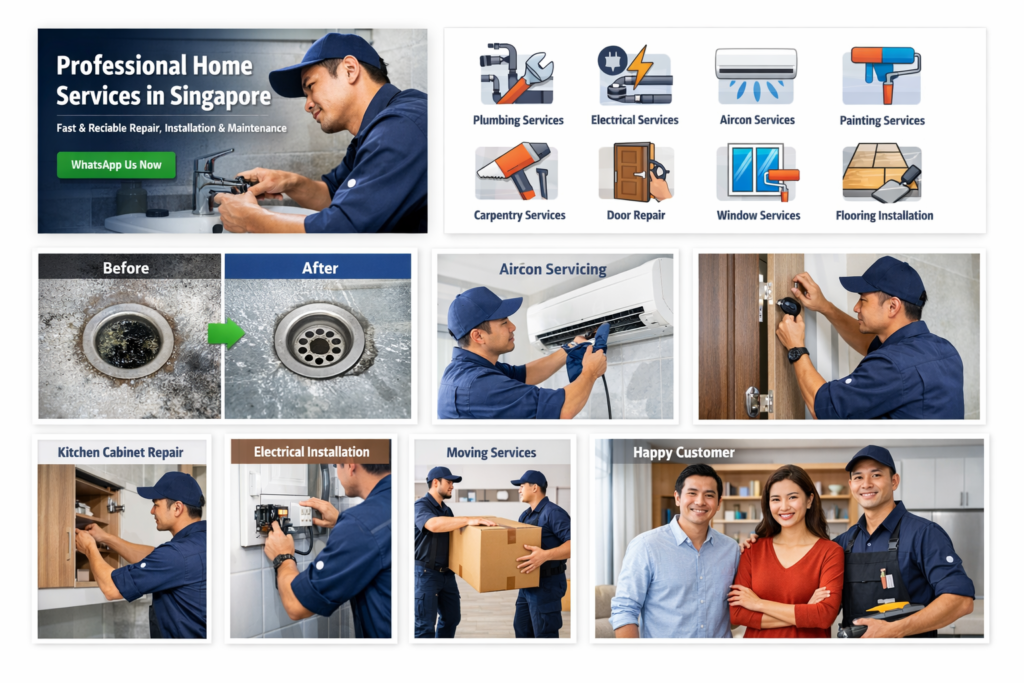 Explore our complete range of professional home services in Singapore, including installation works, door replacement, polishing, electrical, aircon, moving, plumbing, flooring, appliance repair, carpentry, window repair, lighting installation, painting, and renovation services. We provide practical solutions for HDB, condo, landed homes, offices, and commercial properties.